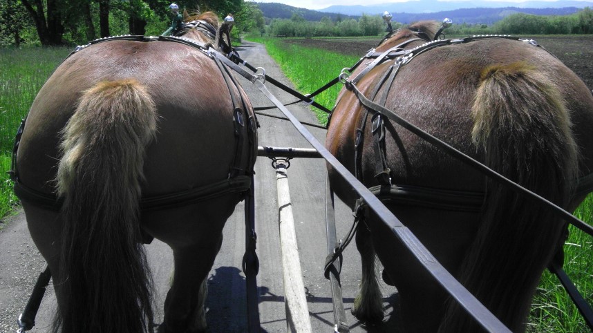 Susan driving Amos and Gunter on Belle Mare Farm